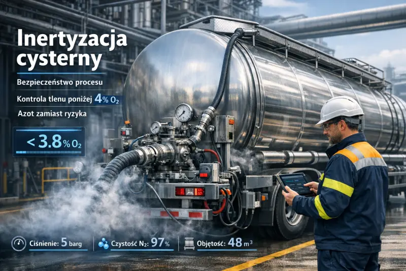 Inertyzacja cysterny polega na zastąpieniu atmosfery zawierającej tlen gazem obojętnym, najczęściej azotem. Cel jest prosty. Trzeba obniżyć zawartość tlenu do poziomu bezpiecznego dla danej operacji. W praktyce chodzi o ograniczenie ryzyka zapłonu, wybuchu, pogorszenia jakości medium albo problemów podczas serwisu i czyszczenia zbiornika.